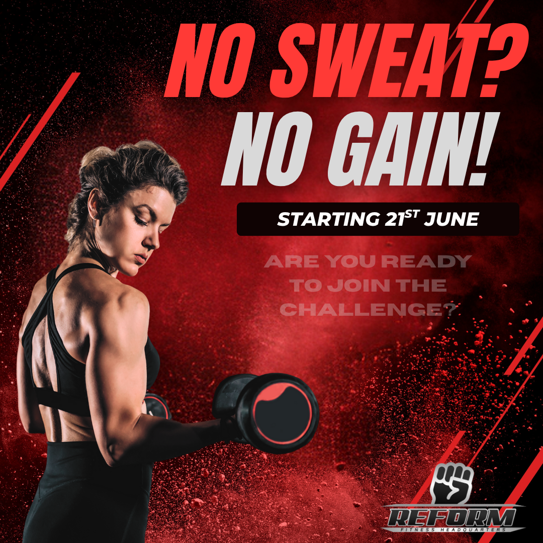 After any workout, post a sweaty gym selfie or short video, tag @reformfitnesshq, and use the hashtag #NoSweatNoGainHQ.